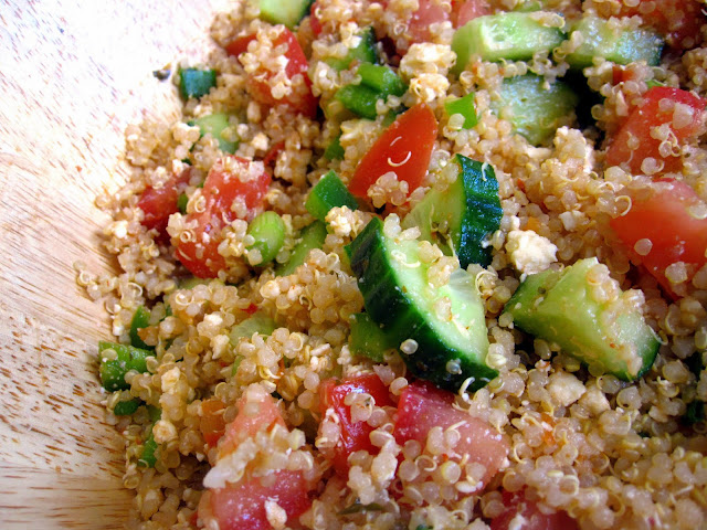 Με μικρές ντομάτες τσέρι, αγγουράκι κομμένο σε κύβους, φέτα, ελιές Καλαμών, ελαιόλαδο, ξίδι και ρίγανη. Αυτή η ελληνική σαλάτα με κινόα. Μαγειρεύετε γρήγορα και μπορεί να σερβιριστεί ως ορεκτικό ή ως ένα πλήρες γεύμα. Αν θέλετε να το σερβίρετε ως κύριο πιάτο, μπορείτε να προσθέσετε μερικά ρεβίθια ή φασόλια.