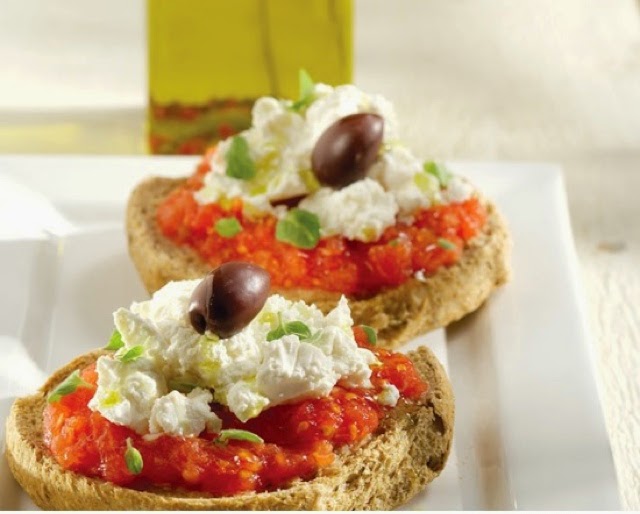 Λιώστε βρασμένα ρεβίθια με ελληνικό γιαούρτι, φέτα, λίγο χυμό λεμονιού και ξύδι. Προσθέστε ελιές Καλαμάτας, κόκκινο κρεμμύδι και αγγουράκι για να γίνει τραγανό, πάνω σε ψητές φέτες ψωμιού. Στο τέλος προσθέστε και τις ντομάτες.