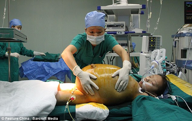 Η Han Bingbing πριν από την επέμβαση, καθώς οι γιατροί την προετοιμάζουν για να κοπεί το τεράστιο τεράτωμα από το στομάχι της.