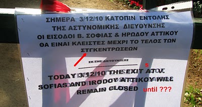 ...η Αστυνομία κάνει επίδειξη ...ανορθογραφίας! Οι είσοδοι Β.Σοφίας & Ηρώδου Αττικού θα είναι κλειστές μέχρι το τέλος των στγκεντρώσεων. Όσο για τους ξένους που θα μπούν στον Εθνικό κήπο από τις άλλες εισόδους και θα εγκλωβιστούν, η...αγγλική μετάφραση της Αστυνομικής εντολής θα τους τρομοκρατήσει. Βλέπετε γράφει ότι οι πόρτες θα παραμείνουν κλειστές (αιωνίως)... adena-gr