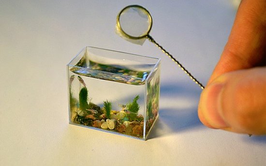 Το ενυδρείο - μινιατούρα έχει χωρητικότητα μόλις δύο κουταλιές νερό. Διαθέτει μικροσκοπικές χρωματιστές πέτρες, φυτά, αλλά και ένα μικροσκοπικό ψάρι.