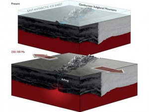 Στη διάρκεια εκατοντάδων εκατομμυρίων ετών, οι κορυφές σταδιακά εξαλείφθηκαν και μόνο η ψυχρή «ρίζα» έμεινε άθικτη. Έπειτα, όμως, και «μόλις» γύρω στα 250 με 100 εκατομμύρια χρόνια πριν, όταν οι δεινόσαυροι κατέκλυζαν τη Γη, ο φλοιός άρχισε πάλι να χωρίζεται, σε μια σειρά από τάφρους κοντά στην παλιά «ρίζα».