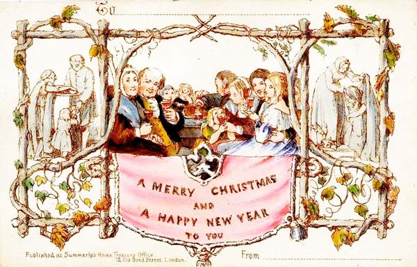 Η πρώτη εμπορική χριστουγεννιάτικη κάρτα στον κόσμο σχεδιάστηκε το 1843 από τον John Callcott Horsley, για το φίλο του Henry Cole, ιδρυτή του Victoria & Albert Museum, μας πληροφορεί το site Scrap Album.