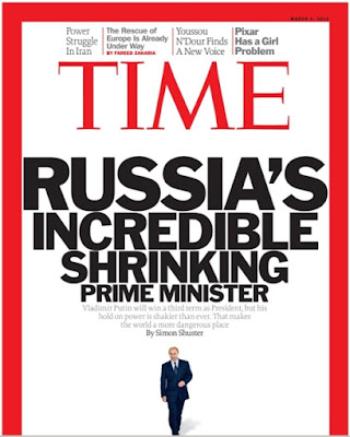 «Η απίστευτη συρρίκνωση του μεγέθους του πρωθυπουργού της Ρωσίας. Ο Βλαντίμιρ Πούτιν θα εξασφαλίσει μια τρίτη θητεία ως πρόεδρος, όμως η επιρροή του στην εξουσία είναι περισσότερο αβέβαιη από ποτέ. Γι' αυτόν τον λόγο ο κόσμος είναι ένα πιο επικίνδυνο μέρος».