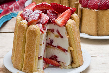 Γεμίζουμε τη φόρμα με το 1/3 της κρέμας, ψιλοκόβουμε από πάνω 100 γρ. φράουλες και καλύπτουμε με μπισκότα τα οποία βουτάμε για πολύ λίγο μέσα στο γάλα.