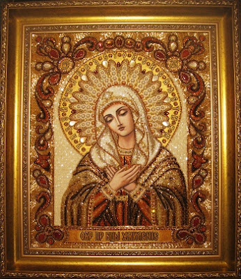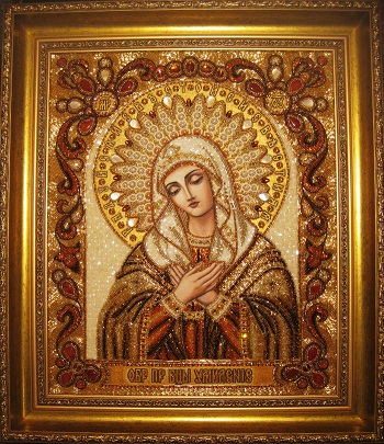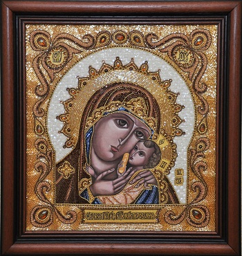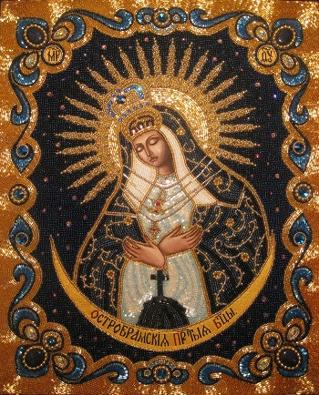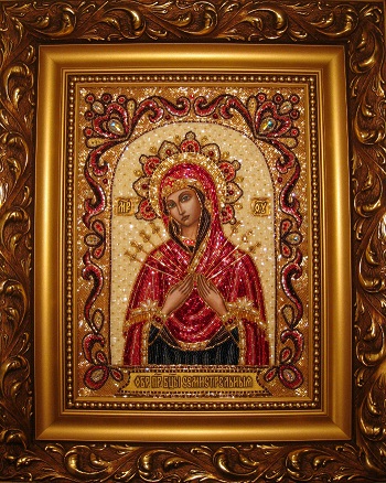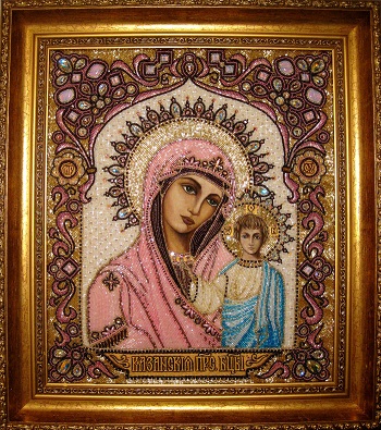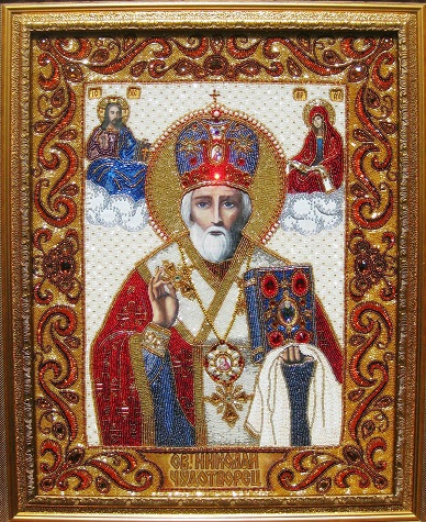 Εικόνες των Αγίων σε λεπτό καμβά.Κεντημένες περίτεχνα στο χέρι και διακοσμημένες με εικόνες αγίων από Ιαπωνικές χάντρες, μαργαριτάρια, φυσικές πέτρες (κορνεόλη, αμέθυστος, λάπις λάζουλι, γρανίτης, μαργαριτάρι, κλπ.), με χρυσά κορδόνια, μεταλλικό νήμα χρυσό, πέτρες και πούλιες.