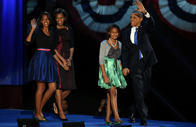 Τα κορίτσια της, βέβαια, κατά τέσσερα χρόνια μεγαλύτερα πια, δεν ακολούθησαν ακριβώς τις αποχρώσεις της μαμάς, όπως στην πρώτη εκλογή Ομπάμα το 2008, αλλά ήταν ντυμένες πιο νεανικά και μοντέρνα και πάντως με γούστο και φινέτσα.