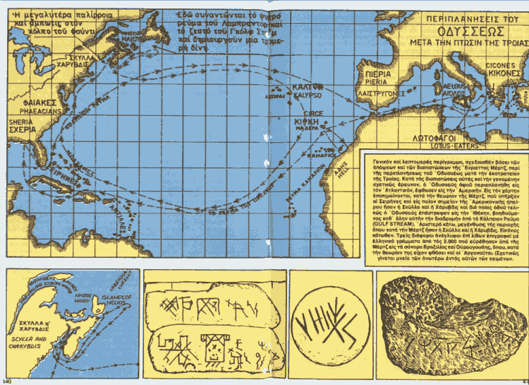 Σχεδιάγραμμα που παρουσιάζει την περιπλάνηση του Οδυσσέα μετά την πτώση της Τροίας βάσει των διαπιστώσεων της Εριέττας Μέρτζ (η οποία μελέτησε εδάφιο προς εδάφιο το κείμενο του Ομήρου σε συνδυασμό με διάφορες νεότερες ανακαλύψεις και παρατηρήσεις που αναφέρονται από τον ίδιο τον Όμηρο π.χ. διάρκεια ταξιδιού κλπ). Στον χάρτη επισημαίνονται η περιοχή που υπήρξαν οι Σειρήνες , σε ποιο σημείο της Αμερικάνικης ηπείρου ήταν η Σκύλλα και η Χάρυβδης και μέσο ποίας οδού ο Οδυσσέας επέστρεψε στην Ιθάκη βοηθούμενος καθ' όλη την διαδρομή από το ρεύμα του κόλπου (Gulf stream) .
