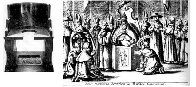 ΥΓ. Ο θρόνος της αριστερής φωτό (sedia stercoraria) φυλάσσεται δι ´ευνοήτους λόγους σε κρύπτη Μουσείου του Βατικανού.
