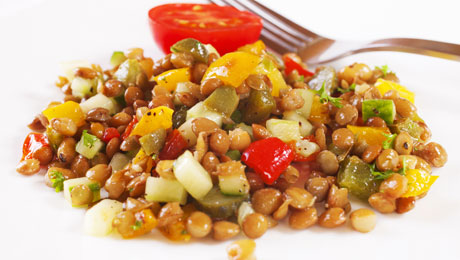 Οι σαλάτες, όταν έχουν περίπου 200 θερμίδες, αποτελούν ένα ιδανικό απογευματινό σνακ. Η συγκεκριμένη περιέχει 11 γρ. πρωτεΐνης και 8 γρ. φυτικών ινών, χάρη στις φακές και τα λαχανικά που περιέχει.