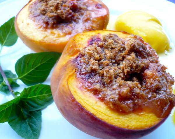 Εύκολη συνταγή οπτικά και γευστικά ακόμη πιο ενδιαφέρουσα όταν οι δύο ημισφαιρικοί όγκοι του ροδάκινου φιλοξενήσουν στο πιάτο ένα κένελ από παγωτό βανίλια, που τους ταιριάζει πολύ - στη φωτό ωστόσο, βλέπετε μάνγκο, αφού είναι η τελευταία μου εμμονή.