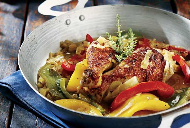 Σιγομαγειρεμένη χωριάτικη κότα με μελωμένη σάλτσα πιπεριάς και μπίρας.