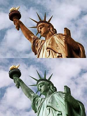 Ο αέρας και το νερό οξείδωσαν το χαλκό, δημιουργώντας επάνω του ένα πρασινωπό στρώμα από ανθρακικό άλας χαλκού.