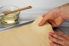 Τοποθετήστε τη ζύμη πάνω στον πάγκο μέσα στο προστατευτικό φιλμ της.Αλείψτε το ταψάκι του φούρνου σας με λίγο λάδι και αναποδογυρίστε μέσα του τη ζύμη.