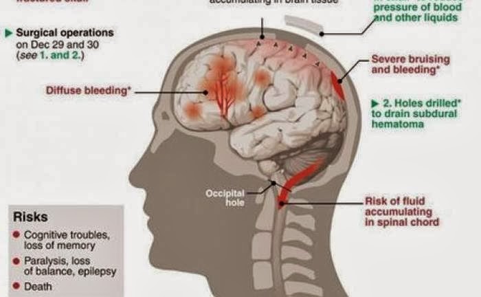 Τα κρανιοεγκεφαλικά τραύματα έχουν οδηγήσει τους γιατρούς ήδη σε 2 επεμβάσεις για την αφαίρεση αίματος και για την εκτόνωση της ενδοκρανιακής πίεσης, αφαιρώντας τμήμα του πάνω μέρους του κρανίου του και κάνοντας τρύπες στο πίσω μέρος.