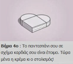 Στην συνέχεια «κόλλα» στις δύο πάνω γωνίες του ρόμβου τα μισοφέγγαρα. Όπως θα δεις, το παντεσπάνι σου έχει πάρει το σχήμα καρδιάς!