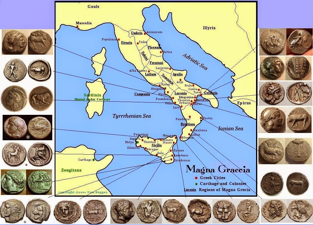 Οι κυριότερες αποικίες της Κάτω Ιταλίας ήταν η Κύμη, η Σύβαρις, ο Κρότων και ο Τάρας. Η Κύμη ήταν η πρώτη αποικία και αντιμετώπισε το διαρκή κίνδυνο των βαρβάρων Τυρρηνών. Αργότερα ήλθε σε επαφή μαζί τους και με τους Λατίνους και τους δίδαξε πολλά.
