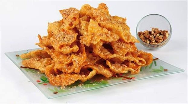 Ανοίγουμε κομμάτια ζύμης σε λεπτά φύλλα με οδοντωτό ροδελάκι. κόβουμε σε διάφορα σχήματα ορθογώνια, λοξά.3 επι 7 εκατοστά,φιογκάκια [κάντε μια κοψιά στο κέντρο κατά μήκος και περάστε μέσα την άκρη την μία ]