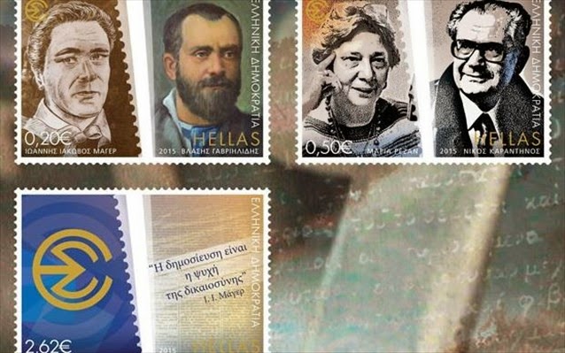 Τέλος, η συλλεκτική σειρά περιλαμβάνει γραμματόσημο με το έμβλημα της ΕΣΗΕΑ και τη ρήση του Ι. Ι. Μάγερ «Η δημοσίευση είναι η ψυχή της δικαιοσύνης», στο οποίο θα αναφερθεί ο π. πρόεδρος της Ένωσης, Νίκος Κιάος.