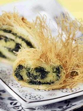 Φτιάξτε ένα ακόμη ρολό με το υπόλοιπο κανταΐφι, σπανάκι και τυρί.