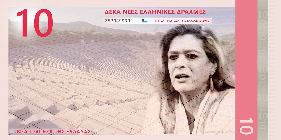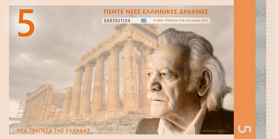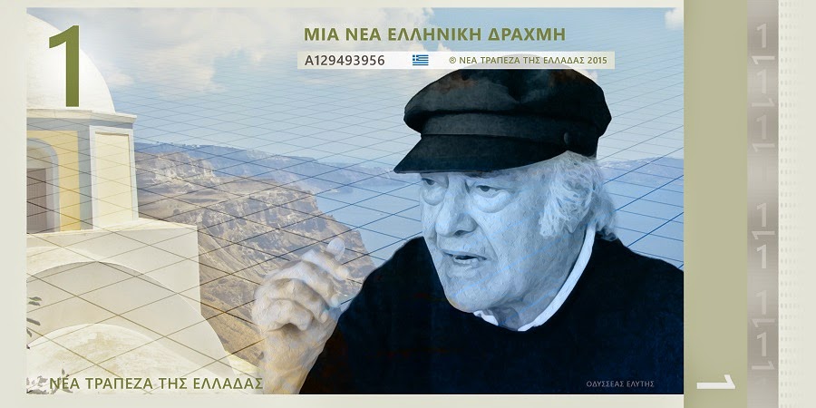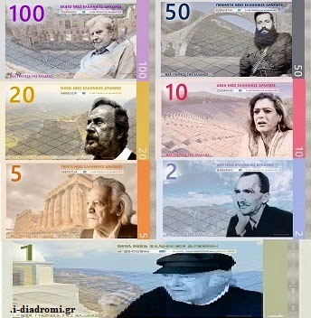 Το χαρτονόμισμα της νέας ελληνικής δραχμής -που αξίζει όσο 30 ευρώ- έχει πάνω τον Οδυσσέα Ελύτη, ο οποίος είχε πει «Εάν η Ελλάδα καταστραφεί τελείως, θα μείνει ένας μαλάκας, μια πουτάνα και ένας ρουφιάνος. Είναι αρκετά για να ξαναχτιστεί από την αρχή.»