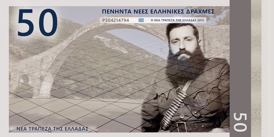 Ο Άρης Βελουχιώτης κοσμεί το χαρτονόμισμα των 50 δραχμών, για να θυμίζει στις Ευρωπαίες εταίρες πως η Ελλάδα δεν τραβάει κανένα ζόρι να γκρεμίσει όλες τις γέφυρες με την Ευρώπη, να κλείσει τα σύνορα και να γίνει Κούβα. Με μπουζούκια.