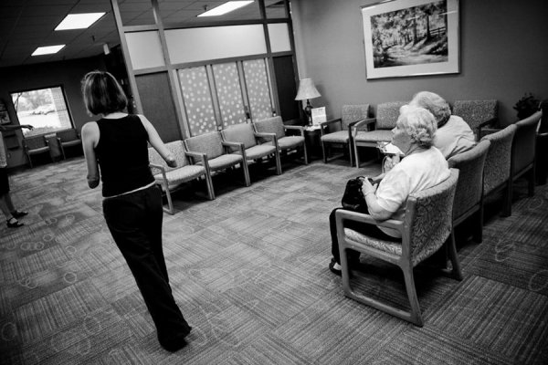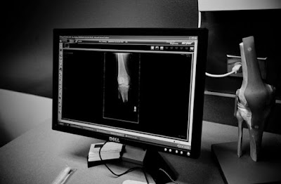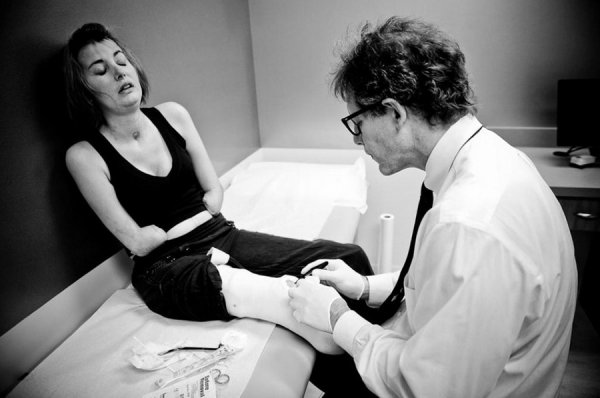 ο Δρ William Nordt εξετάζει την ανοιχτή πληγή στο γόνατό της.