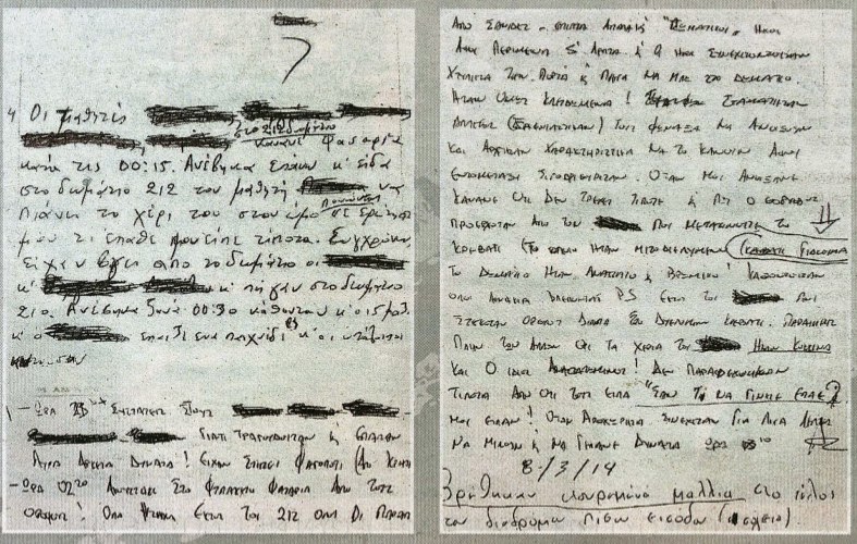 8/3/2014: Ωρα 02.20 ακούστηκε φασαρία από τους πάνω ορόφους. Ολα ήταν ήσυχα εκτός από το δωμάτιο 212 όπου οι παραπάνω φοιτητές έκαναν έντονη φασαρία. Ακούγονταν ήχοι από σανίδες, έπιπλα και σωματικοί ήχοι. Αφού περίμενα πέντε λεπτά και οι ήχοι συνεχίζονταν, χτύπησα την πόρτα και πήγα να δω στο δωμάτιο τι συμβαίνει. Ηταν όμως κλειδωμένα. Σταμάτησαν ξαφνικά τη φασαρία και τους φώναξα να ανοίξουν. Αργησαν χαρακτηριστικά να το κάνουν αφού εν τω μεταξύ σιγοψιθύριζαν. Οταν μου ανοίξανε έκαναν ότι δεν τρέχει τίποτε και πως ο θόρυβος προερχόταν από τον … (αναφέρεται όνομα) που μετακόμιζε το κρεβάτι (το οποίο ήταν μισοδιαλυμένο και ανήκε στον Βαγγέλη Γιακουμάκη). Το δωμάτιο ήταν ανάστατο και βρόμικο. Κάθονταν όλοι αρνάκια βλέποντας το Play Station, εκτός του… (αναφέρεται όνομα) που στεκόταν όρθιος δίπλα από το κρεβάτι. Παρατήρησα ότι τα χέρια του… (αναφέρεται όνομα) ήταν κόκκινα και ο ίδιος αναστατωμένος. Δεν παραδέχθηκαν τίποτα απ’ ό,τι τους είπα. «Σαν τι να γίνεται, επαέ;», μου απάντησαν. Οταν προχώρησα συνέχιζαν για λίγα λεπτά να μιλούν και να γελάνε δυνατά. Ωρα 03.10. Βρέθηκαν κουρεμένα μαλλιά στο τέλος του διαδρόμου, στην πίσω είσοδο. Αποδείχθηκε ότι ήταν από το πατάκι εισόδου. Οταν γύρισε την επόμενη ημέρα ο Βαγγέλης Γιακουμάκης είδε σπασμένο το κρεβάτι του και άρχισε να περιφέρεται στους διαδρόμους ζητώντας από τους συμφοιτητές του τάβλες για να επιδιορθώσει τη ζημιά και να μπορέσει να κοιμηθεί.