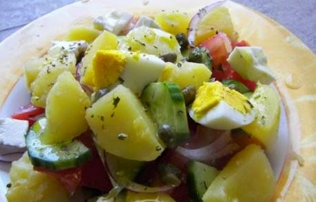 Μια εκδοχή της πατατοσαλάτας με όλο το άρωμα της ελληνικής γης (φέτα, ελιές Καλαμών και φρέσκια ρίγανη). Βράστε τις πατάτες και προσθέστε ντομάτες τσέρι, ελιές καλαμών, τρίματα φέτας και ψεκάστε με σος από ελαιόλαδο, λεμόνι και φρέσκια ρίγανη.