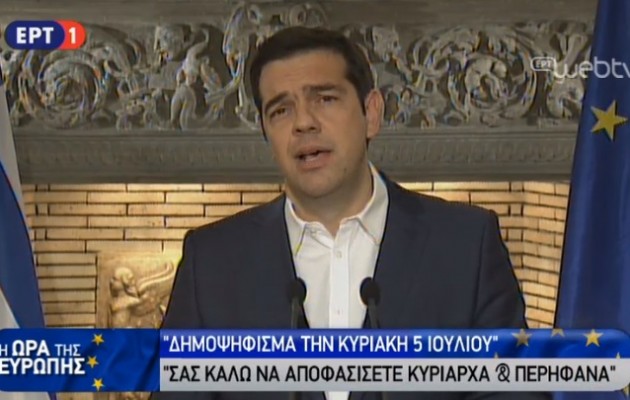 Δημοψήφισμα με το δίλημμα «ναι ή όχι στην πρόταση των δανειστών» προωθεί η κυβέρνηση την Κυριακή 5 Ιούλη, σύμφωνα με διάγγελμα που έκανε πριν από λίγο ο πρωθυπουργός Αλέξης Τσίπρας.