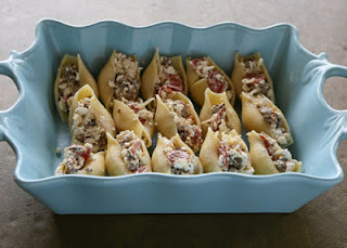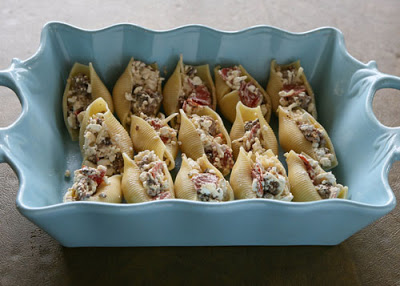 Γεμίζουμε τα κοχύλια με την γέμιση και τα βάζουμε στο έτοιμο ταψί. Απλώνουμε στην κορυφή με την σάλτσα ντομάτας και το τυρί μοτσαρέλα.