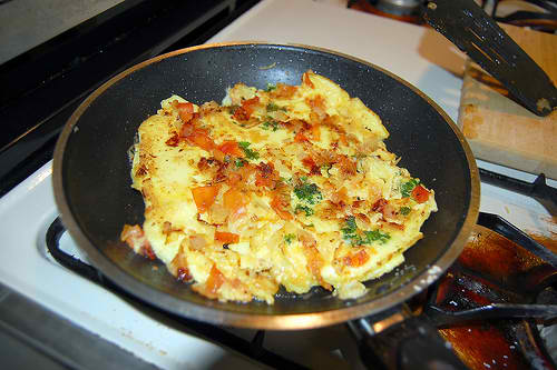 Χτυπάμε τα αυγά με τη ρίγανη και αλατοπίπτερο και τα ρίχνουμε στο τηγάνι.