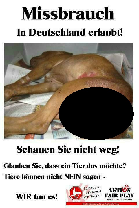 Το συγκεκριμένο σκυλί βιάστηκε σε ΝΟΜΙΜΟ οίκο ανοχής ζώων στη Γερμανία. Το γεγονός βέβαια, ότι υπάρχει νόμιμος οίκος ανοχής ζώων προκαλεί ανατριχίλα, θυμό και αηδία για αυτούς και που το σκέφτηκαν αλλά και όσους το επισκέπτονται!