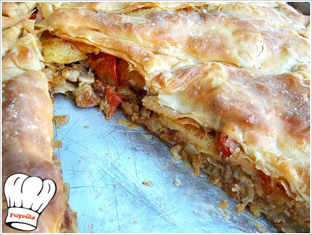 Απλωνουμε την γεμιση που εχουμε στο τηγανι μας, απο πανω καλυπτουμε με τις ντοματες και τελος τις πατατες να καλυψουν την ολη γεμιση. Πασπαλιζουμε με μπολικη παπρικα και γυρναμε τα φυλλα προς τα μεσα.
