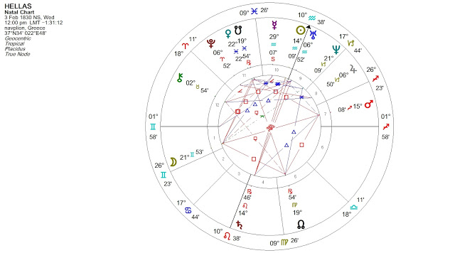 Η Ελλάδα υπήρξε η απαρχή της δικαιώσεως της εθνικής ταυτότητος, κάτι που θα γίνει το εφαλτήριο για την καταστροφή των μεγάλων αυτοκρατοριών (Ρωσικής, Αυστρο-Ουγγρικής, Οθωμανικής, Ισπανικής). Αυτό το βλέπουμε αστρολογικά τόσο από τον Ήλιο της που είναι στον Υδροχόο, από το Μεσουράνημα στον Υδροχόο όσο και από τον Ουρανό στον Υδροχόο.