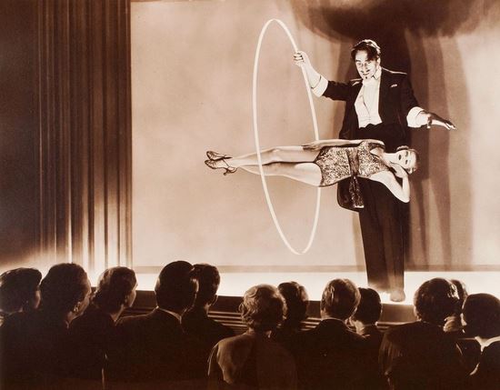 Αυτό το κόλπο χρησιμοποιεί πάλι μια ξύλινη πλάκα στην οποία βρίσκεται η γυναίκα- βοηθός και υπάρχουν ράβδοι που τη συγκρατούν. Αυτή τη φορά ανυψώνεται πάνω από τη σκηνή ώστε να μοιάζει σαν να επιπλέει.
