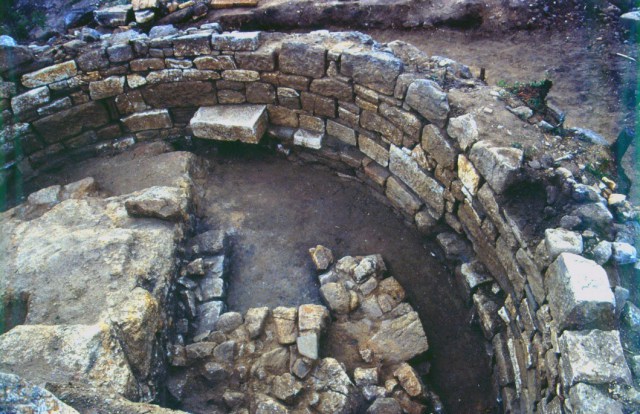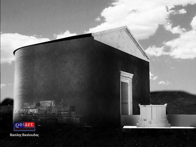 Το ταφικό οικοδόμημα εντοπίστηκε ανάμεσα στη στοά του 5ου αιώνα και στον αρχαϊκό ναό του Διός Σωτήρος και της Αθηνάς Σώτειρας (6ος αιώνας π.Χ.), μεταξύ της αρχαϊκής και της κλασικής πόλης, στη χερσόνησο «Λιοτόπι». Η αψιδωτή του κάτοψη (10 περίπου μέτρα), το σχήμα του, η ύπαρξη ορθογώνιου μαρμαροθετημένου δαπέδου με κενή επιφάνεια-βωμό (1,30x1,70 μ.) είχαν προβληματίσει πολύ τον αρχαιολόγο ερευνητή, καθώς περιβάλλει επακριβώς έναν τετράγωνο βυζαντινό πύργο.