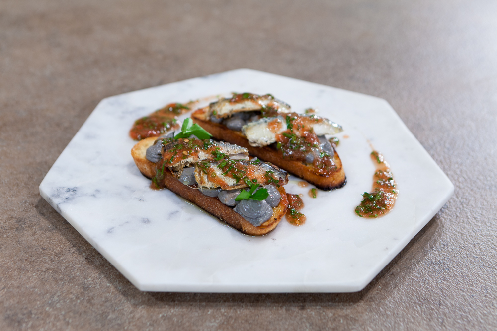 Απλώνουμε τον μαύρο ταραμά πάνω στις ψημένες φέτες ψωμιού, με μια σακούλα ζαχαροπλαστικής. Προσθέτουμε τις σαρδέλες και βάζουμε λίγη από τη βινεγκρέτ, ραντίζουμε με ωμό ελαιόλαδο και σερβίρουμε.