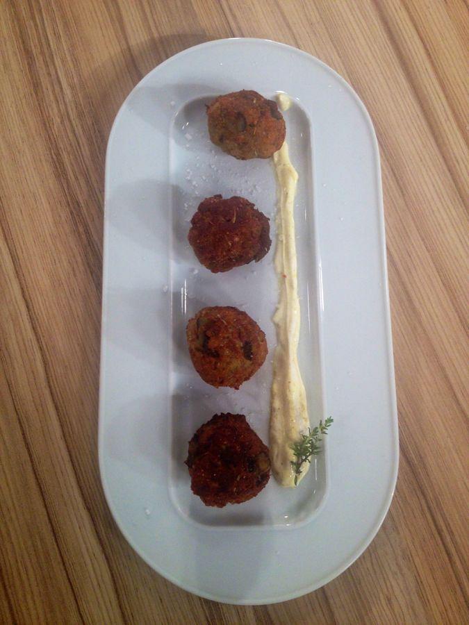 Πλάθουμε κεφτεδάκια και τα τηγανίζουμε σε καυτό ελαιόλαδο, χωρίς να τα αλευρώσουμε.