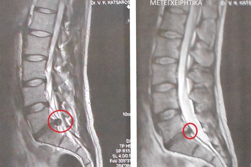 Μαγνητική τομογραφία ασθενούς,προεγχειρητική και μετεγχειρητική, ο οποίος υποβλήθηκε σε διατρηματική δισκοπλαστική