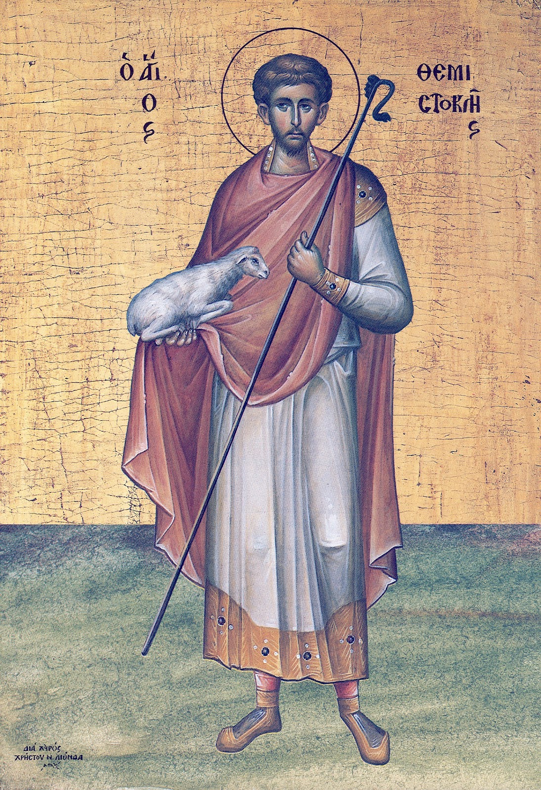 Ο άγιος Θεμιστοκλής καταγόταν από τα Μύρα της Λυκίας και έζησε την εποχή του αυτοκράτορα Δεκίου. Ήταν βοσκός στο επάγγελμα.