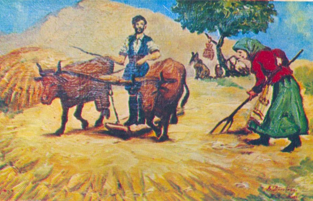 ΄Ωρες ολόκληρες βολοδέρνουν τα ζωντανά πατώντας με τις βαριές οπλές τους το στάρι, αργά, ράθυμα, υπομένοντας και καμιά καμουτσιά από τον αγρότη που έχει ήδη ζαλιστεί από τους γύρους κάτω από τον ανελέητο ΄Ηλιο.
