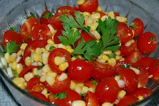 Προσθέτουμε και το καλαμπόκι, τη ντομάτα, το κρεμμύδι και το μαϊντανό.